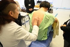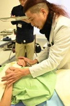 実技では少人数のグループに分かれ、互いにモデルとなりあいながら、実際に体に触れて、その反応を学びました。